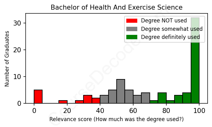 The verdict? Slightly above average. Overall, with an average relevance score of 70%, Health And Exercise Science graduates have a slightly higher likelihood (+3%) of finding work in this field compared to the average graduate across all fields: