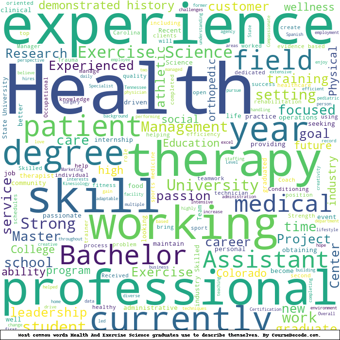 Here is a visual representation of the most common words seen in the "about" section of LinkedIn profiles who have a Bachelor degree in Health And Exercise Science. This may or may not be useful:
