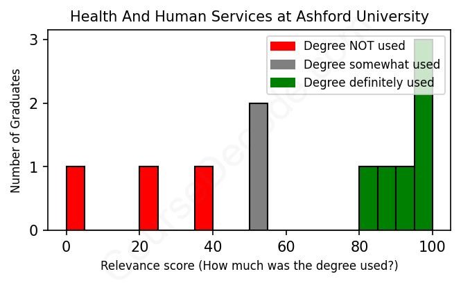 The verdict? Slightly below average. Overall, with an average relevance score of 65%, Health And Human Services graduates from Ashford University have a slightly lower likelihood (-2%) of finding work in this field compared to the average graduate across all fields: