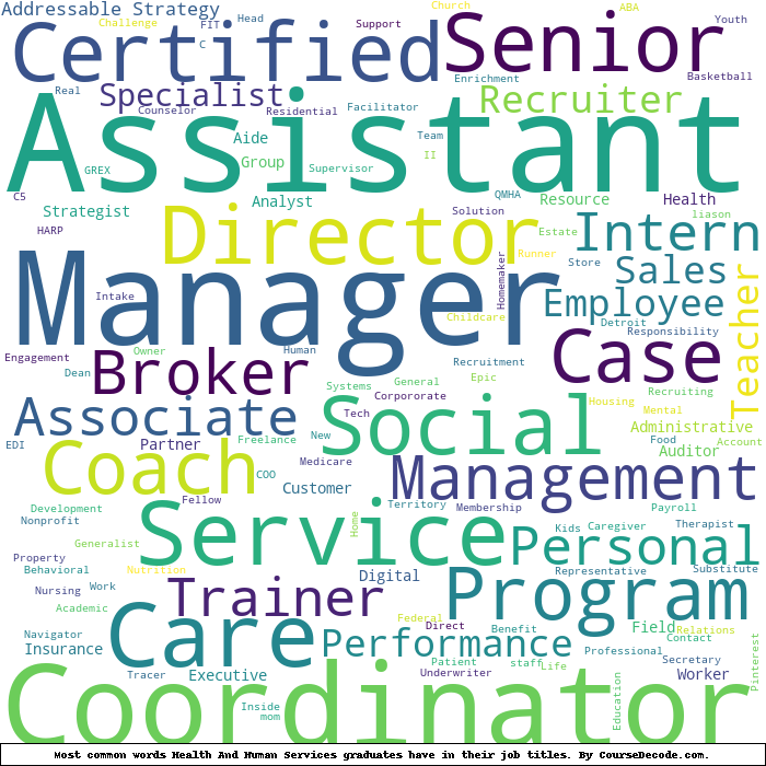 Here is a visual representation of the most common words in job titles for Health And Human Services graduates (this is across all Health And Human Services graduates we've analyzed, not just those who went to Ashford University):
