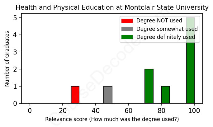 The verdict? Significantly above average. Overall, with an average relevance score of 79%, Health and Physical Education graduates from Montclair State University have a much higher likelihood (+12%) of finding work in this field compared to the average graduate across all fields:
