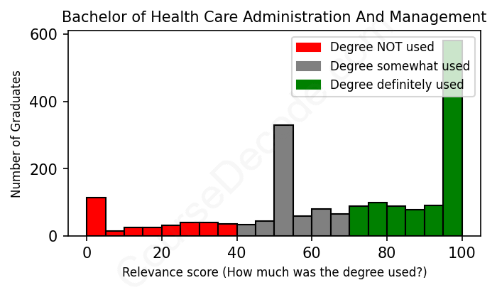 The verdict? On par with the average. Overall, with an average relevance score of 67%, Health Care Administration And Management graduates have about the same likelihood of finding work in this field as the average graduate across all fields: