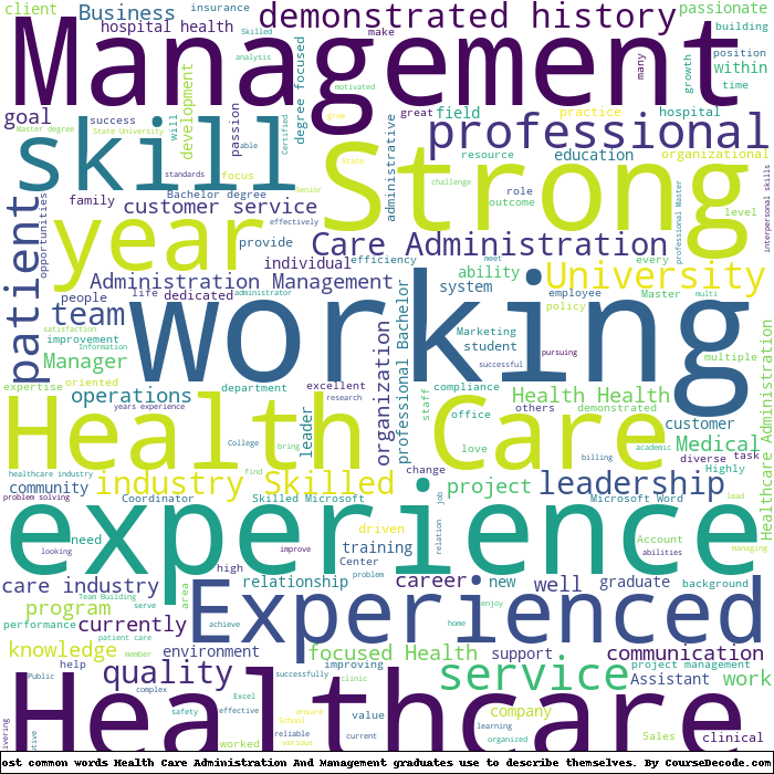 Here is a visual representation of the most common words seen in the "about" section of LinkedIn profiles who have a Bachelor degree in Health Care Administration And Management. This may or may not be useful: