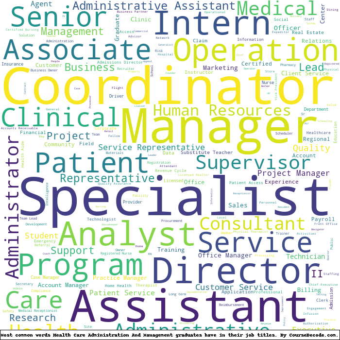 In conclusion, while a significant portion of graduates with degrees in Health Care Administration and Management pursue relevant roles directly tied to their field of study, there remains a diverse array of career paths taken by these individuals. The overall trend shows that health management principles are vital in many roles; however, there is still a noticeable number of positions where graduates find themselves in jobs that do not fully leverage their education. This distinction highlights both the versatility of the degree and the disparities in job relevance across various sectors.Here is a visual representation of the most common words in job titles for Health Care Administration And Management graduates: