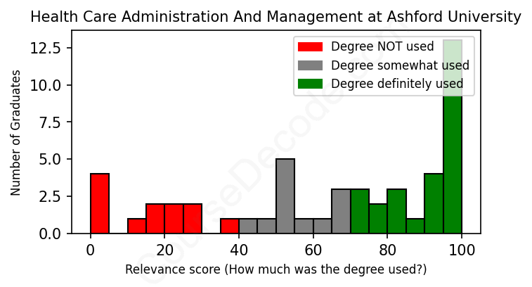 The verdict? Slightly below average. Overall, with an average relevance score of 64%, Health Care Administration And Management graduates from Ashford University have a slightly lower likelihood (-3%) of finding work in this field compared to the average graduate across all fields: