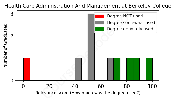 The verdict? Below average. Overall, with an average relevance score of 59%, Health Care Administration And Management graduates from Berkeley College have a lower likelihood (-8%) of finding work in this field compared to the average graduate across all fields: