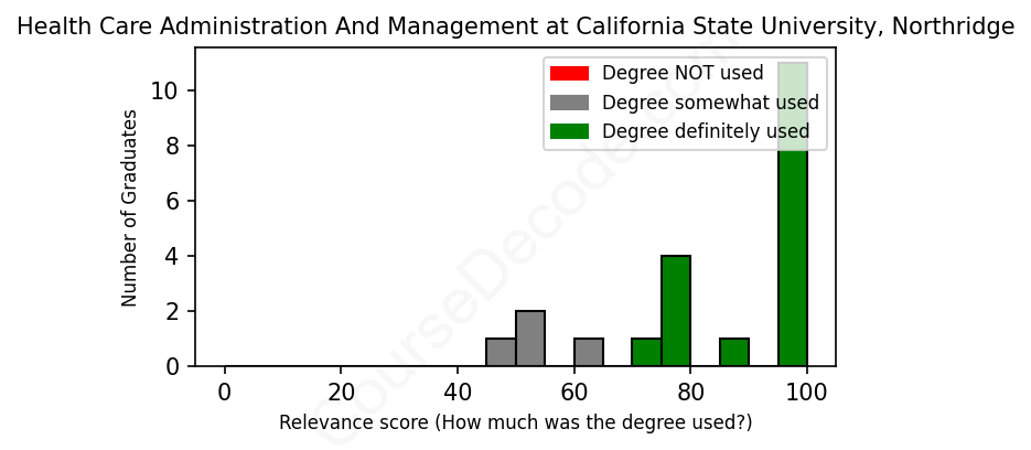 The verdict? Significantly above average. Overall, with an average relevance score of 84%, Health Care Administration And Management graduates from California State University, Northridge have a much higher likelihood (+17%) of finding work in this field compared to the average graduate across all fields: