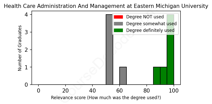 The verdict? Above average. Overall, with an average relevance score of 76%, Health Care Administration And Management graduates from Eastern Michigan University have a higher likelihood (+9%) of finding work in this field compared to the average graduate across all fields: