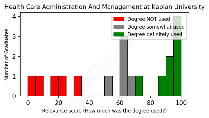 The verdict? Slightly below average. Overall, with an average relevance score of 62%, Health Care Administration And Management graduates from Kaplan University have a slightly lower likelihood (-5%) of finding work in this field compared to the average graduate across all fields: