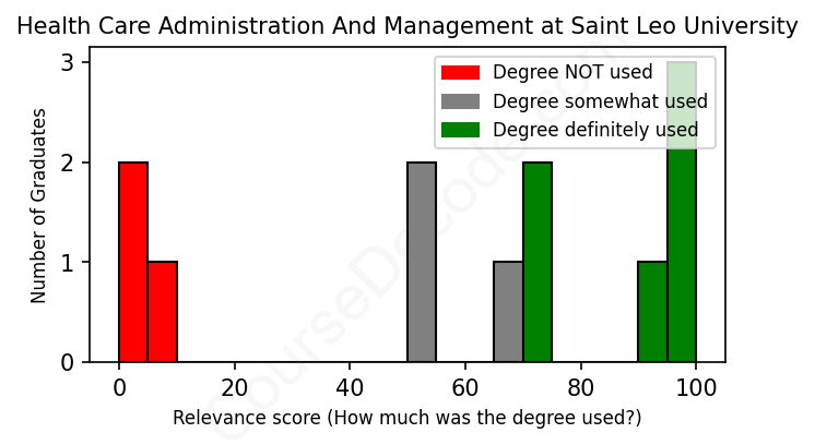 The verdict? Below average. Overall, with an average relevance score of 59%, Health Care Administration And Management graduates from Saint Leo University have a lower likelihood (-8%) of finding work in this field compared to the average graduate across all fields: