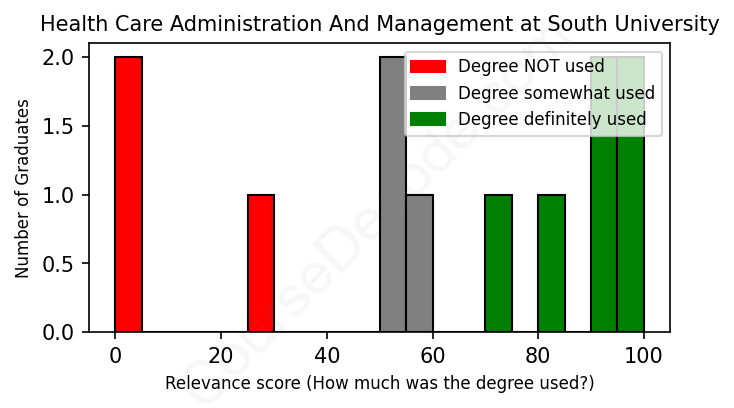 The verdict? Below average. Overall, with an average relevance score of 60%, Health Care Administration And Management graduates from South University have a lower likelihood (-7%) of finding work in this field compared to the average graduate across all fields: