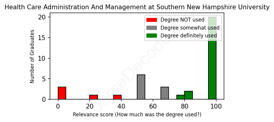The verdict? Above average. Overall, with an average relevance score of 75%, Health Care Administration And Management graduates from Southern New Hampshire University have a higher likelihood (+8%) of finding work in this field compared to the average graduate across all fields: