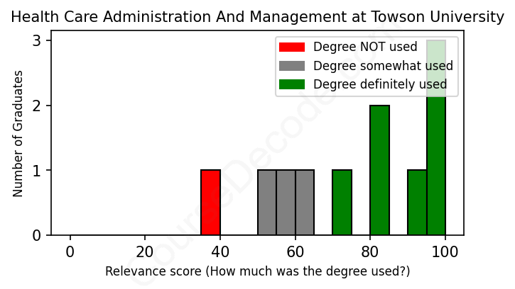 The verdict? Above average. Overall, with an average relevance score of 74%, Health Care Administration And Management graduates from Towson University have a higher likelihood (+7%) of finding work in this field compared to the average graduate across all fields: