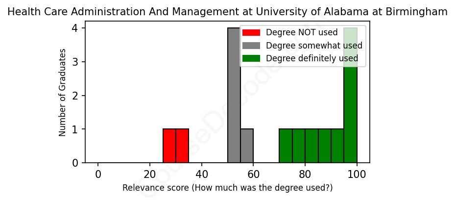 The verdict? Slightly above average. Overall, with an average relevance score of 70%, Health Care Administration And Management graduates from University of Alabama at Birmingham have a slightly higher likelihood (+3%) of finding work in this field compared to the average graduate across all fields: