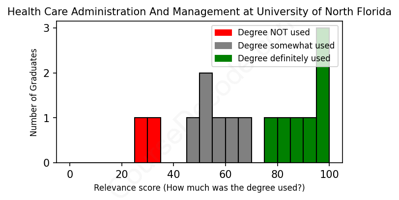 The verdict? Slightly above average. Overall, with an average relevance score of 68%, Health Care Administration And Management graduates from University of North Florida have a slightly higher likelihood (+1%) of finding work in this field compared to the average graduate across all fields:
