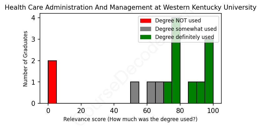 The verdict? Slightly above average. Overall, with an average relevance score of 69%, Health Care Administration And Management graduates from Western Kentucky University have a slightly higher likelihood (+2%) of finding work in this field compared to the average graduate across all fields: