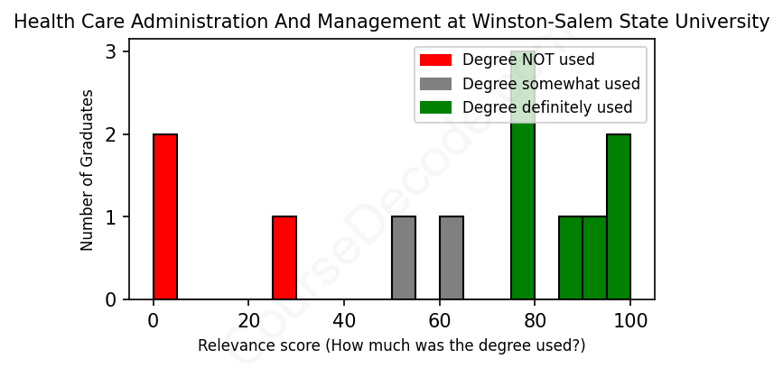 The verdict? Below average. Overall, with an average relevance score of 61%, Health Care Administration And Management graduates from Winston-Salem State University have a lower likelihood (-6%) of finding work in this field compared to the average graduate across all fields: