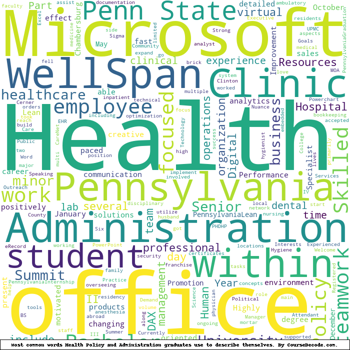 Here is a visual representation of the most common words seen in the "about" section of LinkedIn profiles who have a Bachelor degree in Health Policy and Administration (this is across all Health Policy and Administration graduates we've analyzed, not just those who went to Penn State University). This may or may not be useful: