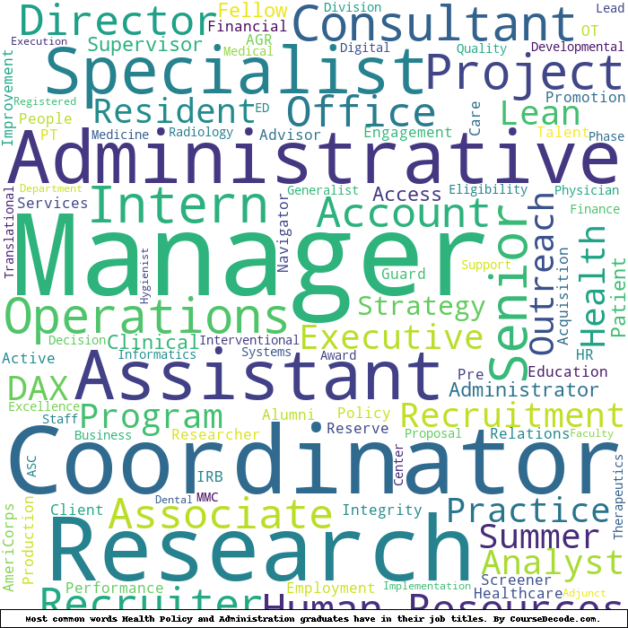 Here is a visual representation of the most common words in job titles for Health Policy and Administration graduates (this is across all Health Policy and Administration graduates we've analyzed, not just those who went to Penn State University):