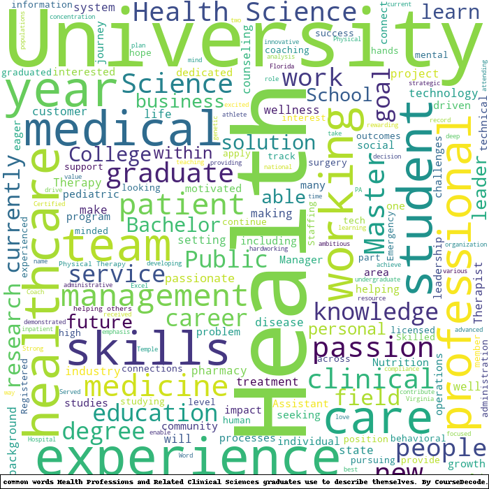 Here is a visual representation of the most common words seen in the "about" section of LinkedIn profiles who have a Bachelor degree in Health Professions and Related Clinical Sciences. This may or may not be useful: