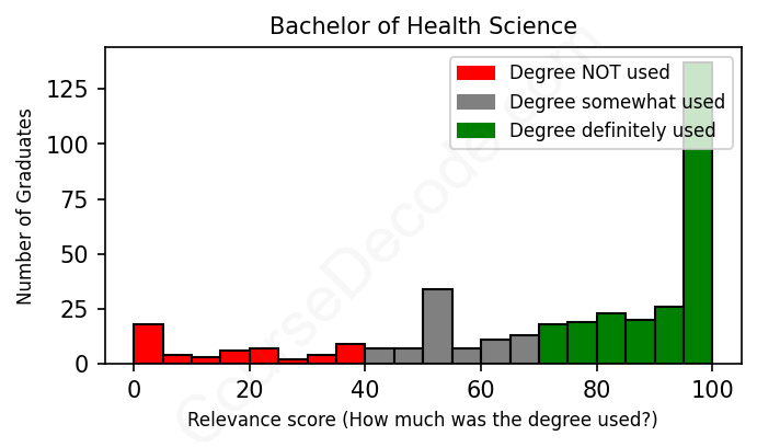 The verdict? Above average. Overall, with an average relevance score of 73%, Health Science graduates have a higher likelihood (+6%) of finding work in this field compared to the average graduate across all fields: