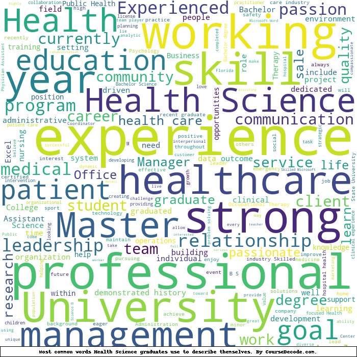 Here is a visual representation of the most common words seen in the "about" section of LinkedIn profiles who have a Bachelor degree in Health Science. This may or may not be useful: