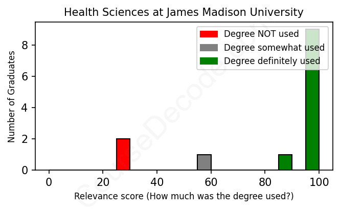 The verdict? Significantly above average. Overall, with an average relevance score of 83%, Health Sciences graduates from James Madison University have a much higher likelihood (+16%) of finding work in this field compared to the average graduate across all fields: