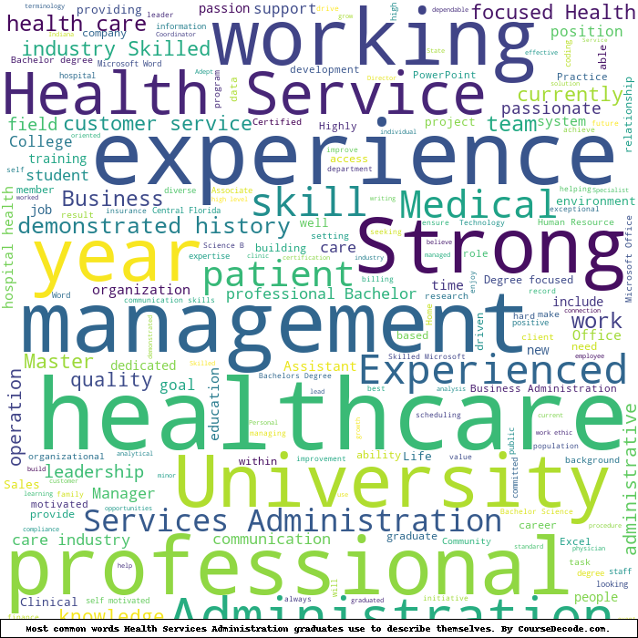 Here is a visual representation of the most common words seen in the "about" section of LinkedIn profiles who have a Bachelor degree in Health Services Administration. This may or may not be useful: