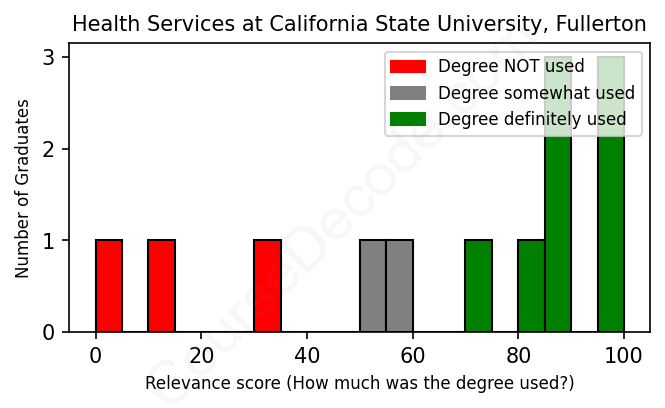 The verdict? Slightly below average. Overall, with an average relevance score of 66%, Health Services graduates from California State University, Fullerton have a slightly lower likelihood (-1%) of finding work in this field compared to the average graduate across all fields:
