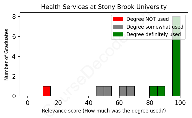 The verdict? Significantly above average. Overall, with an average relevance score of 80%, Health Services graduates from Stony Brook University have a much higher likelihood (+13%) of finding work in this field compared to the average graduate across all fields: