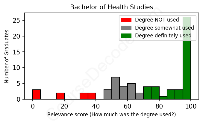 The verdict? Slightly above average. Overall, with an average relevance score of 72%, Health Studies graduates have a slightly higher likelihood (+5%) of finding work in this field compared to the average graduate across all fields: