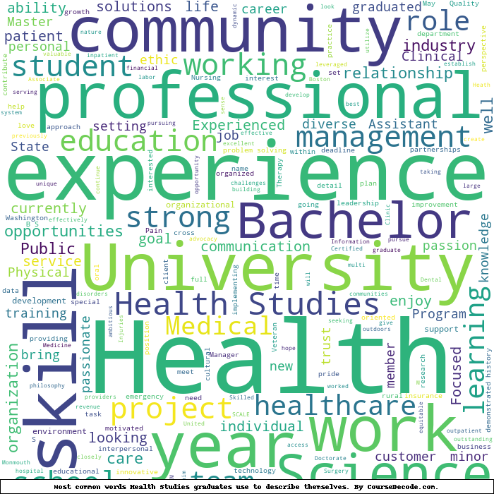 Here is a visual representation of the most common words seen in the "about" section of LinkedIn profiles who have a Bachelor degree in Health Studies. This may or may not be useful: