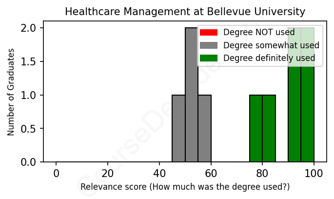 The verdict? Above average. Overall, with an average relevance score of 74%, Healthcare Management graduates from Bellevue University have a higher likelihood (+7%) of finding work in this field compared to the average graduate across all fields: