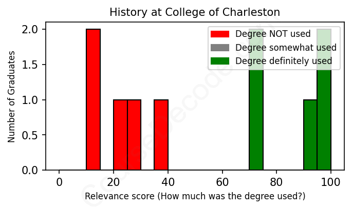 The verdict? Significantly below average. Overall, with an average relevance score of 54%, History graduates from College of Charleston have a much lower likelihood (-13%) of finding work in this field compared to the average graduate across all fields: