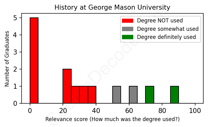 The verdict? Horrible! Overall, with an average relevance score of 29%, History graduates from George Mason University have an exceptionally lower likelihood (-38%) of finding work in this field compared to the average graduate across all fields: