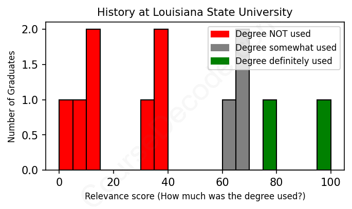 The verdict? Bad. Overall, with an average relevance score of 42%, History graduates from Louisiana State University have a substantially lower likelihood (-25%) of finding work in this field compared to the average graduate across all fields: