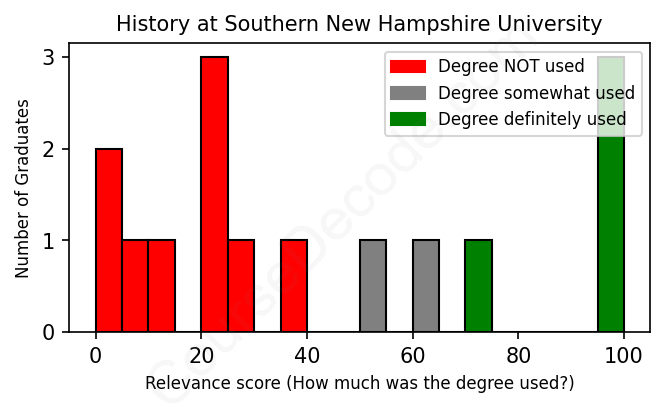 The verdict? Bad. Overall, with an average relevance score of 42%, History graduates from Southern New Hampshire University have a substantially lower likelihood (-25%) of finding work in this field compared to the average graduate across all fields: