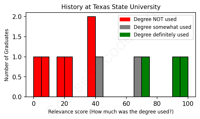 The verdict? Bad. Overall, with an average relevance score of 44%, History graduates from Texas State University have a substantially lower likelihood (-23%) of finding work in this field compared to the average graduate across all fields: