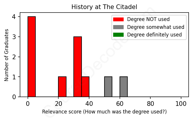 The verdict? Horrible! Overall, with an average relevance score of 24%, History graduates from The Citadel have an exceptionally lower likelihood (-43%) of finding work in this field compared to the average graduate across all fields: