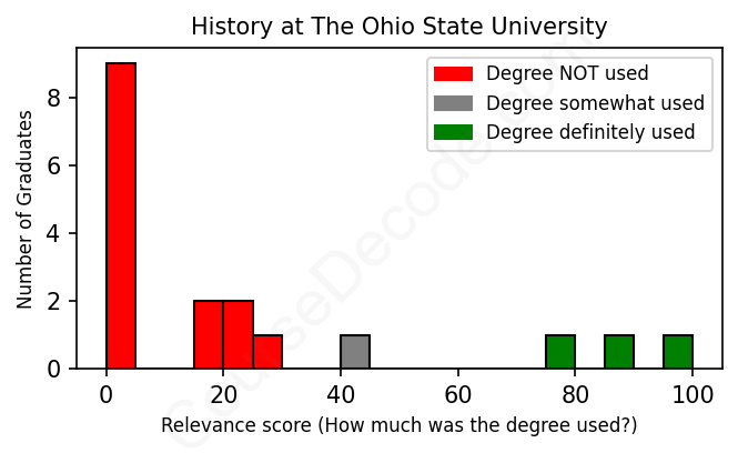 The verdict? Horrible! Overall, with an average relevance score of 23%, History graduates from The Ohio State University have an exceptionally lower likelihood (-44%) of finding work in this field compared to the average graduate across all fields: