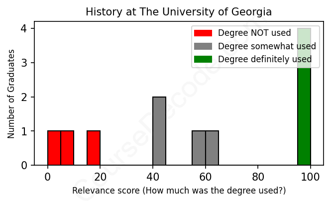 The verdict? Significantly below average. Overall, with an average relevance score of 56%, History graduates from The University of Georgia have a much lower likelihood (-11%) of finding work in this field compared to the average graduate across all fields: