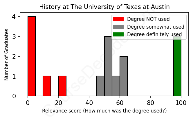 The verdict? Bad. Overall, with an average relevance score of 44%, History graduates from The University of Texas at Austin have a substantially lower likelihood (-23%) of finding work in this field compared to the average graduate across all fields: