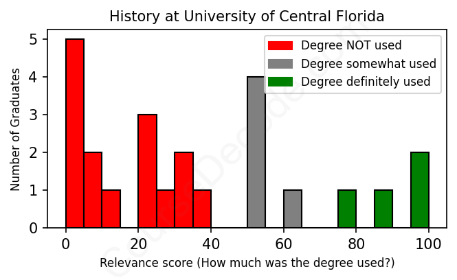 The verdict? Horrible! Overall, with an average relevance score of 35%, History graduates from University of Central Florida have an exceptionally lower likelihood (-32%) of finding work in this field compared to the average graduate across all fields:
