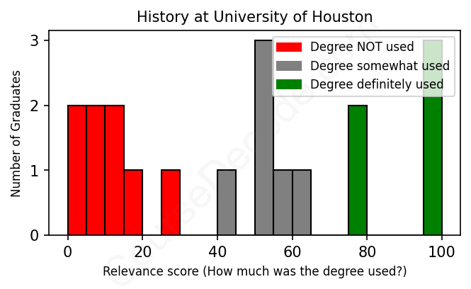 The verdict? Bad. Overall, with an average relevance score of 44%, History graduates from University of Houston have a substantially lower likelihood (-23%) of finding work in this field compared to the average graduate across all fields: