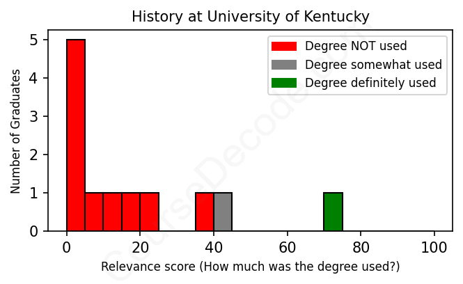 The verdict? Horrible! Overall, with an average relevance score of 17%, History graduates from University of Kentucky have an exceptionally lower likelihood (-50%) of finding work in this field compared to the average graduate across all fields: