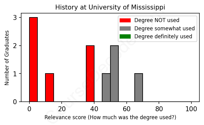 The verdict? Horrible! Overall, with an average relevance score of 29%, History graduates from University of Mississippi have an exceptionally lower likelihood (-38%) of finding work in this field compared to the average graduate across all fields: