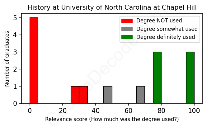 The verdict? Bad. Overall, with an average relevance score of 46%, History graduates from University of North Carolina at Chapel Hill have a substantially lower likelihood (-21%) of finding work in this field compared to the average graduate across all fields: