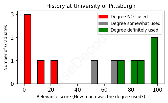 The verdict? Significantly below average. Overall, with an average relevance score of 49%, History graduates from University of Pittsburgh have a much lower likelihood (-18%) of finding work in this field compared to the average graduate across all fields:
