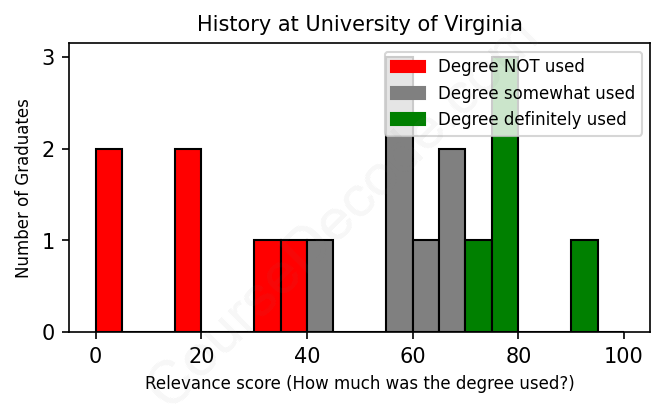 The verdict? Significantly below average. Overall, with an average relevance score of 50%, History graduates from University of Virginia have a much lower likelihood (-17%) of finding work in this field compared to the average graduate across all fields: