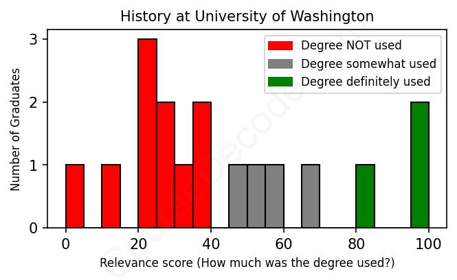 The verdict? Bad. Overall, with an average relevance score of 43%, History graduates from University of Washington have a substantially lower likelihood (-24%) of finding work in this field compared to the average graduate across all fields:
